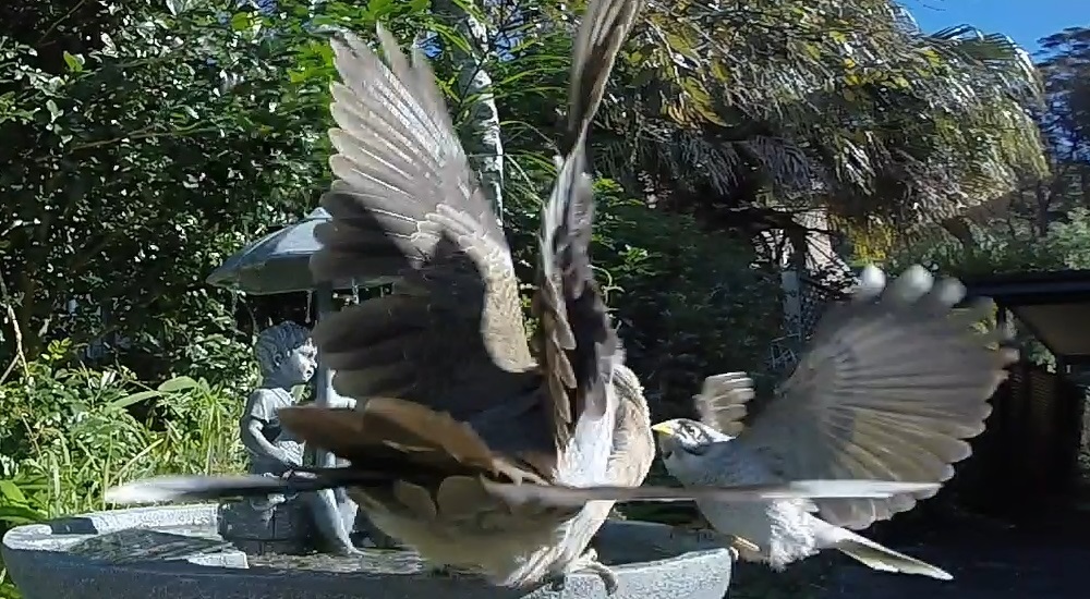 He hopped up. “I wish”, he says eating a mouthful of grapes, “I wish I had the courage to silence that noisy miner.” Thy wish be done.